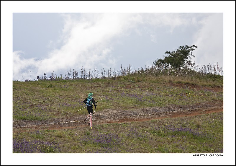Me amanece en el desvío de las dos modalidades, llevo 7:30 esperando este momento y al levantar la vista veo un autentico paraíso botánico, me emociono, llevo mucho tiempo sin sentir esta sensación y se me escapa alguna lagrima. Yo a lo mío, dosificando, pero empieza una bajada muy técnica por piedra rota, la zona de las presas, llevo bastones pero no se para que los llevo, es algo que me lo tengo que mirar; o aprendo a utilizarlos o los dejo en casa. Sufro algún adelantamiento y una pájara. Vuelven los fantasmas del pasado, ¿ya valgo yo para esto? Me tomo un gel de cafeína, antes no me atrevía a tomarlos, con un ibuprofeno y decido luchar, hoy es el día, hoy o nunca.